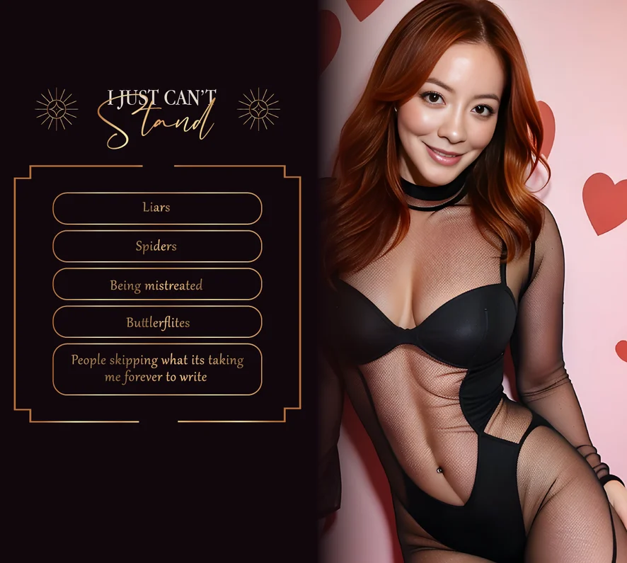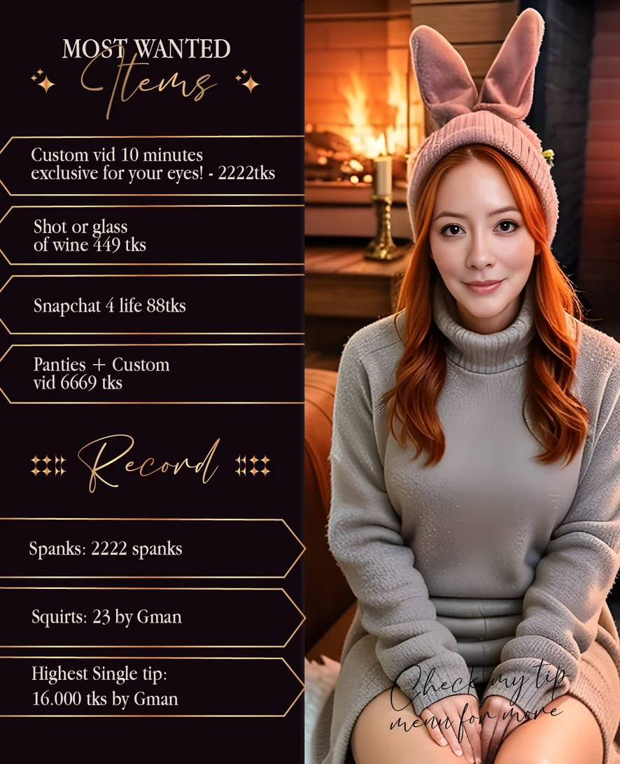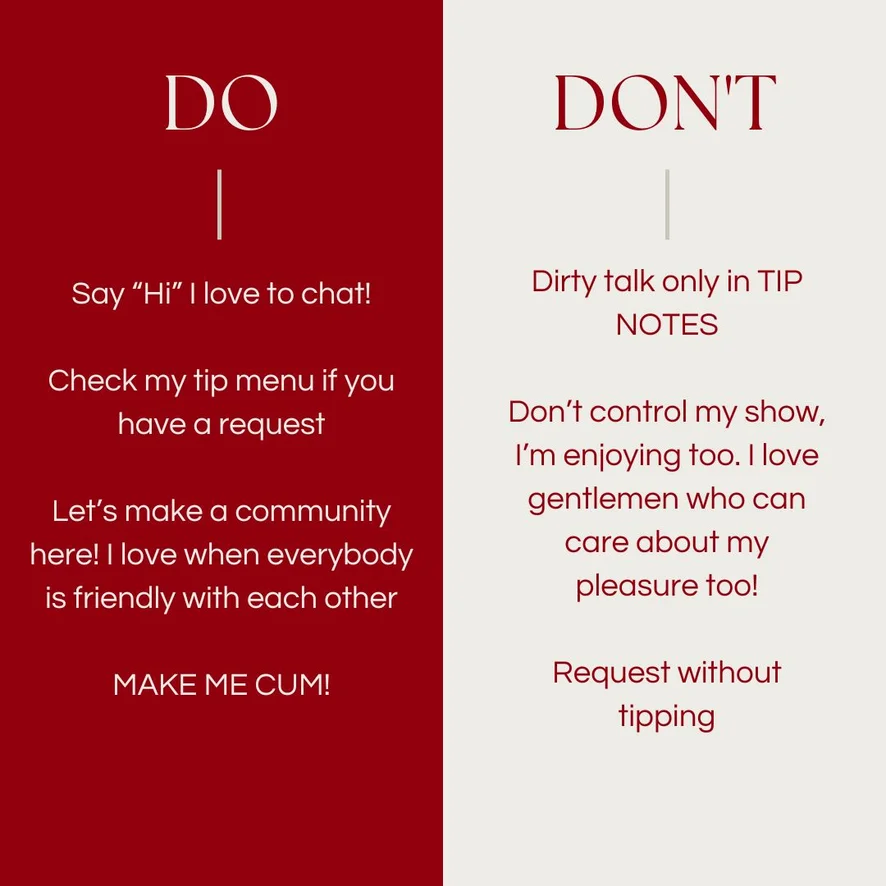 Mély torok, Orgazmus, Spriccelés, Ondós punci, Szopás, Dildó vagy vibrátor, Erotikus tánc, Ujjazás, Kézimunka, Olajozás, Szexjátékok, Fenekelés, Félmeztelen, Mocskos beszéd, Kutyapóz, Villantás, Szájpecek, Maszturbálás, Cici baszós, Felcsúszott szoknya, Twerk, Sztriptíz, Arcra ülés, Lovaglás, Tevepata, Megalázás, Anál